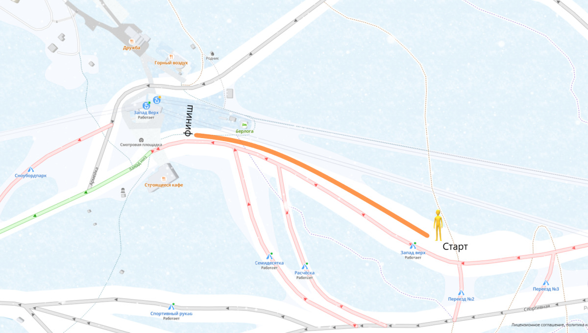 • Трасса: старт с середины горнолыжной трассы «Запад‑верх» и финиш на средней станции г. Большевик.